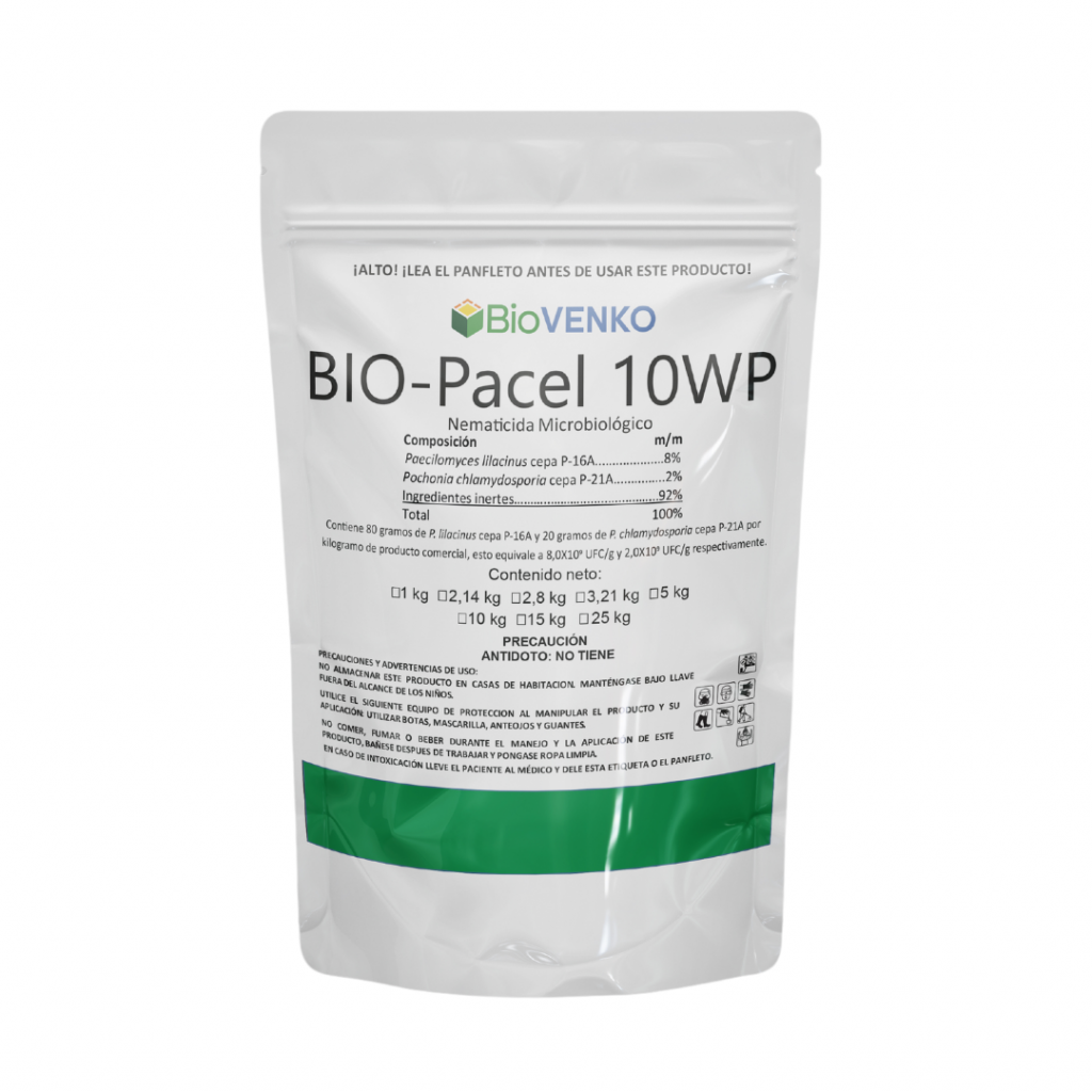 Los nematodos son gusanos microscópicos que atacan las raíces de las plantas. El daño provoca raíces deformes, con pocas raíces secundarias; lo que afecta la absorción de nutrientes, asi como el crecimiento y rendimiento de las plantas. Para el manejo de estas plagas generalmente se usan productos químicos altamente tóxicos (banda roja). Bio-Pacel 10 WP, por su parte, es un producto biológico, formulado con hongos aislados del suelo costarricense. Bio-Pacel 10 WP reduce las poblaciones de nematodos y las mantiene bajas, en niveles donde no producen daño económico. El producto se categoriza en el nivel de menor toxicidad (banda verde), por lo que su aplicación es segura y efectiva; puede ser aplicado aún durante la floración y fructificación, porque la acción no se transloca de la raíz a los órganos superiores. La formulación favorece la penetración del suelo, la estabilidad a temperatura ambiente y la fácil aplicación en campo.